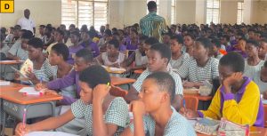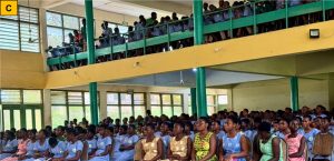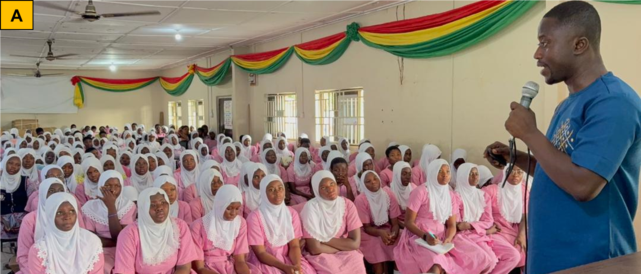 Image: Science engaging with students at (A) T.I. Ahmadiyya Girls Senior High School, (B) New Aperade Senior High/Technical School, (C) New Abirem/Afosu Senior High School, (D) Adeiso Presbyterian Senior High School, and (E) Awutu Bawjiase Senior High School.